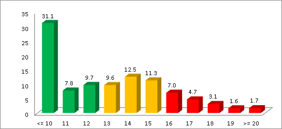 Graph 1 illustrates percentages of the different possible values in subtitling speed and Graph 2 shows these same percentages focusing on genres and in three different groups, namely, above 15 cps and therefore not complying with the recommendations of the UNE Standard (in red), between 13 and 15 cps (in yellow) and equal to or below 12 cps (in green), therefore complying with the maximum established according to existing theory outlined in the present article.