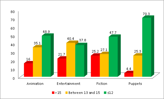 Animation and puppets are the genres that present a lower percentage of subtitles that demand excessively fast subtitle reading. These genres are usually addressed at younger audiences and, generally speaking, the presence of dialogue is less frequent and uttered at a lower speed (cf. Zarate 2010b). In other words, because they are addressed at very young children, these genres encode more information through non-linguistic signification codes (iconography, lighting, music, special effects…) and the audiovisual texts themselves present different characteristics. The dialogue fragments are fewer and of slower utterance and allow more exposure time for subtitles on screen.