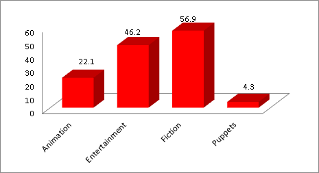 ivided into animation (cartoons, computer-animated cartoons, anime and animated films), fiction (series and films), entertainment (quizzes and handicrafts) and puppets.