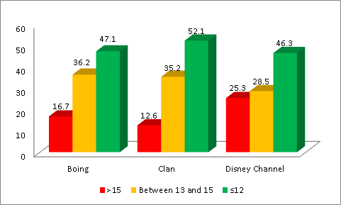 The maximum speed recommended by the UNE Standard, as explained earlier, is 15 cps. This Standard, nevertheless, has been designed for the whole hearing impaired community and does not take into account the specific needs and expectations of children. Taking this Standard as a reference, the analysis shows that both in general terms and for each TV channel, the recommendation for maximum speed is generally fulfilled. All three channels broadcast more than two thirds of their subtitles at 15 cps or slower (Boing 83.3%; Clan 87.3%; Disney Channel 74.8%). However, complying with recommendations of a Standard that has not been specifically designed for the youngest audiences does not necessarily guarantee an adequate subtitle speed for the reading and processing of captions within their audiovisual context. Having established a subtitle speed for hearing impaired children of 12 cps as an adequate maximum according to the theoretical review, it can be concluded that only around half of the subtitles of each channel are broadcast at this speed or slower (Boing 47.1%; Clan 52.1%; Disney Channel 46.3%). This conclusion leads to the hypothesis that, in the absence of a study validated by participant involvement and observation, around half of the subtitles broadcast by the TV channels exclusively dedicated to the youngest audiences in Spain cannot be read, processed and understood by their target audience with hearing impairment within an audiovisual context.