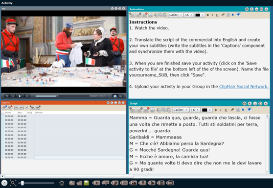 Participants from the experimental groups were required to translate the three clips from Italian into English. The teacher encouraged students to compare their L1 with the L2 while they were translating by focusing both on grammar issues (i.e. subject number-verb agreement, tenses, use of articles) and differences in pragmatic realisation (by asking them things such as: “In English we would use a question here; what would you say in Italian?”), thus eliciting a contrastive analysis from the students. After each viewing and translating sessions, the subtitling and the dubbing groups went on to use ClipFlair Studio with our technical assistance. ClipFlair, an EU-funded project for foreign language learning, has led, among other things, to the creation of ClipFlair Studio, an online platform where users (both tutors and learners) can create, upload and access revoicing and captioning activities to learn a foreign language. We instructed the learners on how to use the platform and had them perform a simulation before data collection. Moreover, we created ad hoc activities on the platform for the present study. Experimental Group RS used ClipFlair to add subtitles to each commercial, while Experimental Group RD used the platform to dub them into English (Figure 1). Students worked in pairs using the computers that were available in the classroom.