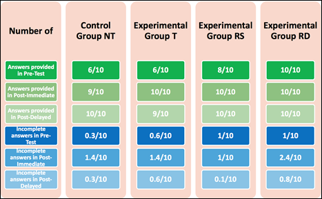 As Figure 3 illustrates, the Control Group and Experimental Group T provided a lower number of answers in the pre-test, but that positively evolved in the post-tests. The number of answers provided by the three Experimental Groups and the Control Group in the post-immediate and post-delayed test is quite homogeneous. This allows for a better comparison of the results among the groups involved in the study. With regard to incomplete answers, the situation is more diverse from group to group. The Control Group and Experimental Group T show similar performances in the pre-test and the post-immediate test. In the post-immediate test, the number of incomplete answers is higher for both groups and then decreases in the post-delayed test. Although providing more incomplete answers in all tests, Experimental Group RD and RS show similar behaviour to the Control Group and Experimental Group T. However, Experimental Group RS shows an important change in the post-delayed test and the lowest number of incomplete answers both in the post-immediate and post-delayed tests, compared to the other groups. Notably, the number of incomplete answers in the post-delayed test drops from 1 to 0.1 out of 10. This improvement could be tentatively ascribed to the positive effects of the experimental activity, i.e. the reverse subtitling task, in the long-term perspective.