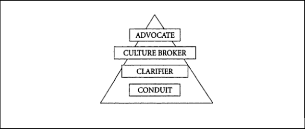 The cultural broker model represents a much more participative role and enhances the condition of the interpreter as cultural expert who detects cultural misunderstandings and provides the necessary cultural framework to resolve any misunderstanding.