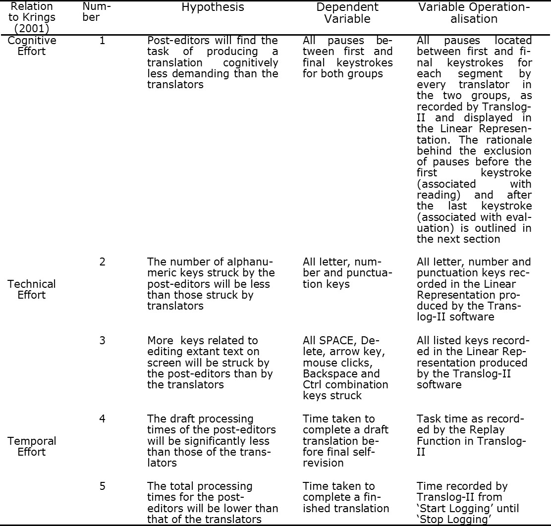 No evaluation of Google Translate for Welsh translators has yet been published, and so variables that are relevant to professional translation for this language pair are yet to be considered, despite the government policies mentioned above. As Daelemans & Hoste (2009) and Ramon (2010) note, using translation as a baseline and comparing the practical benefit of post-editing against it is an essential part of MT evaluation within a professional context. The hypotheses listed in Table 1 were tested. The dependent variables measured are noted, along with a description of how the variable was measured. In terms of cognitive effort, the theory behind the metric chosen is described in the next section.