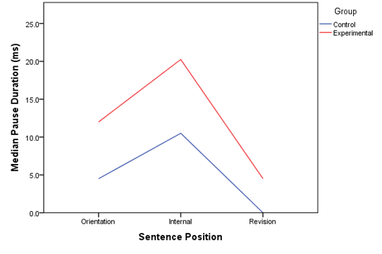Figure 1. Average pause duration (ms) for both groups in all pause positions