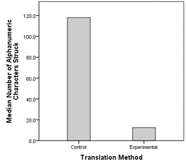 Hypothesis 2 predicted that the translators would in fact produce more alphanumeric characters as text would need to be typed anew. The Null Hypothesis was rejected in this case. The CG produced more alphanumeric characters during text production processes (M= 114, Mdn= 114) than their EG counterparts (M= 18, Mdn= 12.5), and this difference was statistically significant. Bootstrapping was used when performing the independent T-test due to the non-parametric nature of the data (96, BCa CI 95% (81.7, 112.1), t(12.6)= 70, p= .000). It can also be deduced from this finding that the post-editors in the EG tended not to rewrite translations. This difference is represented in Figure 2 below, where this significant difference can clearly be seen: