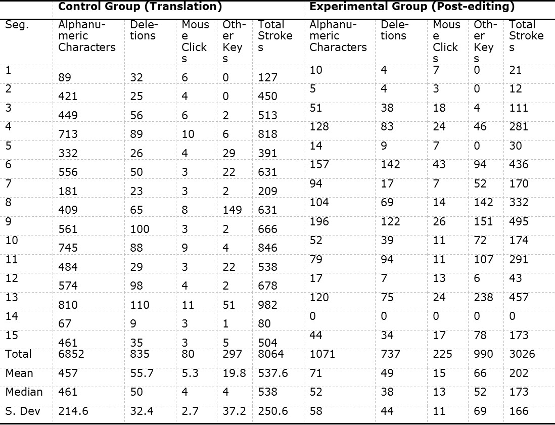 In Table 2 below, summary statistics are offered for the total of all keystrokes recorded in every segment. The ‘Other Keys’ column refers to use of arrows, the space bar and CRTL combinations.