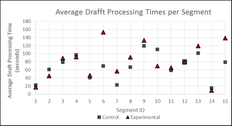 Finally, differences in processing time will be discussed. Productivity is not analysed due to the relatively modest number of segments processed (120). Taking first of all the processing times recorded before the process of final revision (called here ‘draft processing times’), where every participant went through a completed draft making a small number of changes to some segments, no statistical differences could be discerned between the two groups4. These draft processing times were captured using the replay function in Translog-II. The central tendencies of the time taken to complete a segment on average by both groups were similar: CG Mean = 63 seconds, SD = 39, CI (53, 74), EG Mean = 62 seconds, SD = 41, CI (51.8, 73.2). As the processing times for each segment processed by each participant was the only dataset to have a normal distribution, an independent T-test was used without bootstrapping to test for differences between means. The result (t(181) = 118, p = .857) showed no statistically significant difference between the draft processing times for both groups, as to be expected given the almost identical means. The Effect Size was also small (d = 0.1). The Null Hypothesis was accepted as a result and deductive Hypothesis 4 was rejected. These data are illustrated in Figure 3 below: