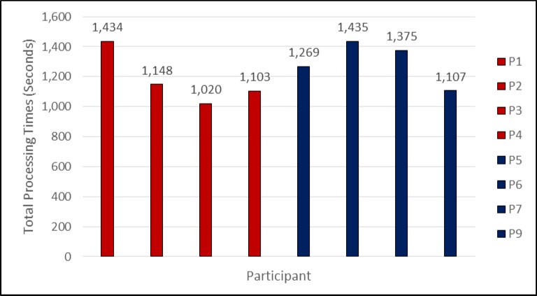 In terms of total processing time, i.e. the time recorded from the start of the session in Translog-II to the time ‘Stop Logging’ was pressed by the participant after completing final self-revision, post-editing did not lead to automatic reductions in the time taken to complete a professional translation. It should be noted however that P5, P6 and P9 in the EG were quicker than P1 in the CG, and that P9, the quickest post-editor, was 5.17 minutes quicker than P1 and 40 seconds quicker than P2. Also, taking the average time taken to process each segment by both groups, it should be noted that in 33.3% of cases, the machine translated segments were processed faster than when the same segments were translated by the translators who didn’t have access to MT. Equally however, translation was quicker on average in the remaining 67.7% of cases. Hypothesis 5 then must be rejected. These differences between Total Processing Times are displayed graphically in Figure 4 below. Red bars denote CG data and blue bars denote EG data.
