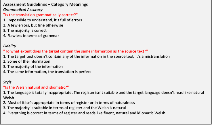 Reviewers were sent an Excel spreadsheet containing all translations produced by participants in the CG (Set A) in one tab, and all translations produced by the EG (Set B) in another tab. This review was blind; no reviewer knew which tab contained which set of translations. Reviewers were asked to rate the translations of both groups against the source text (Appendix A), using a scale of 1-4, where 1 was the poorest score and the 4 the best. Each translation was judged for grammatical accuracy, fidelity and style. The criteria used in Fiederer & O’Brien’s 2009 study were therefore replicated despite a change in terminology; grammatical accuracy corresponds to clarity and fidelity to accuracy. A consideration of register was also added to ‘Style.’ The definitions used are shown in Figure 5. No reviewer knew which set was produced through manual translation and which was produced through post-editing.