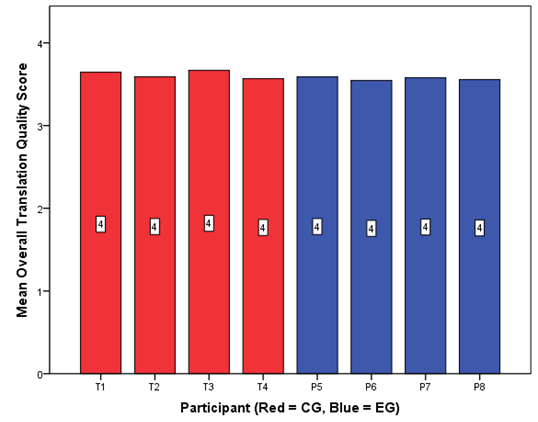 All three parameters (grammatical accuracy, fidelity and style) were taken together and the average calculated using the mean in order to gain a single translation quality score for each translator in both groups. This result is shown in Figure 6 below. As can be seen, there is little difference in this overall translation quality score and all participants had a mean score of 4 which was the highest score possible. This lack of difference was then confirmed by a Wilcoxon signed rank test (p = .162).