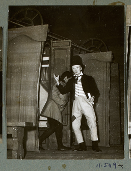 Les spectacles de Marceau et de Hanka n’ont pas été filmés. Nous les aborderons donc à partir d’un complexe multimodal dans lequel chaque mode peut être vu comme une traduction intersémiotique des autres (Weissbrod et Kohn 2019 : 173). Le mimodrame Les Trois perruques a donné lieu à deux séries de photographies (Pic 1953 ; Weill 1953) dont certaines ont été prises pendant les répétitions. D’autres sont des portraits d’acteurs en costumes et maquillage, parfois dans des poses caractéristiques de leur personnage. On distingue des types sociaux dans un registre comique, parfois grotesque.