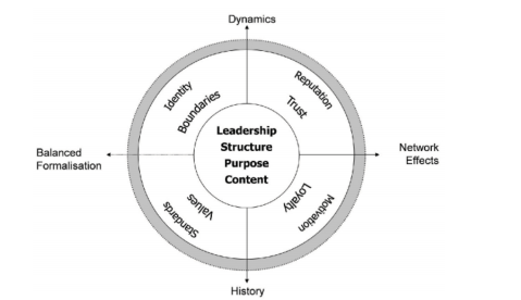 Selon le modèle ci-dessus, une communauté doit avoir un ou plusieurs fondateurs, une certaine forme de direction (leadership), un objectif commun (purpose) et doit être concentrée sur le contenu produit par ses membres (content). La communauté doit disposer d’une masse critique de membres répondant aux critères posés (identity/boundaries), établissant des relations (reputation/trust) et motivés à communiquer dans les formes standardisés (motivation/loyalty), en respectant les valeurs (standards/values). L’histoire (history) et le dynamisme (dynamics) de la communauté sont influencés par une formalisation qui repose sur les normes et les effets du réseau (network effects).