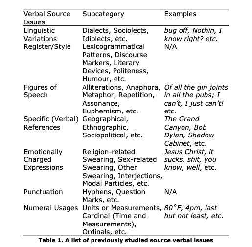 Source verbal issues refer to the particularly difficult points in the verbal information of the original audiovisual texts that make explicit the mutilation of subtitling on verbal source. They mostly, but not completely, correspond to traditional print-based verbal translation issues. In addition to being linguaculturally confined, subtitling is also spatial-temporally limited by technical matters and synchronised with ST. Certain points in the verbal source that would not be considered to be an issue in traditional print-based translations can be debatable in subtitling, such as punctuation and numbers. Focusing on verbal aspects from the represented dimension, this subsection mainly discusses source verbal issues as analytical points (including examples) prevailing in English language. Current literature that has explored a vast set of source verbal issues of subtitling include: Nedergaard-Larsen (1993), Perego (2004), Díaz Cintas and Remael (2007), Geogakopoulou (2009), Gottlieb (2009), Pettit (2009), and Pedersen (2011). Together, they provide a list of diverse source verbal issues, as shown in Table 13. It should be noted that this list, partly extracted from different scholarly works, is by no means a comprehensive or clearly segmented chart of source verbal issues. Rather, it is presented here to show the many possible issues that can showcase the violence of subtitling on the verbal source and, thus, can be used to identify analytical points for the current framework.