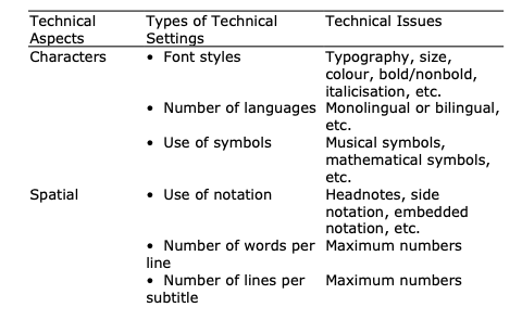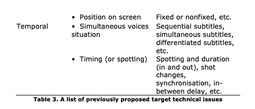 In the representing dimension, as said above, target issues are those particularly difficult points in the target that make subtitling explicitly violent on the target. Target issues can be different from source issues. Arguably, subtitled audiovisual texts are overall a target text, as subtitles are synchronic with the original audiovisual texts. However, only the target subtitles have corresponding parts in the source that can form a translational analysis. Therefore, regarding approaches to the disruption on the target, only subtitles are analysed. Subtitles are written verbal texts that are technically programmed, whereby the target verbal and technical systems are violently used to represent the source. In the representing dimension, target issues, hence, can be further divided into technical issues and verbal issues.