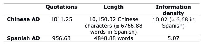 Table 2. Means of quotations, length, and information density in Chinese and Spanish ADs