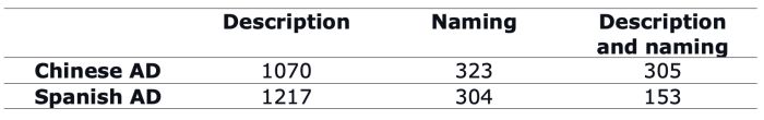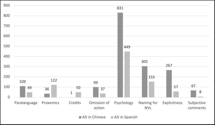Explanations regarding AD approaches will be provided when presenting the qualitative results. Below we will focus on the most notable differences between Chinese and Spanish ADs which concern psychology from a quantitative point of view and its relationship with NVL.