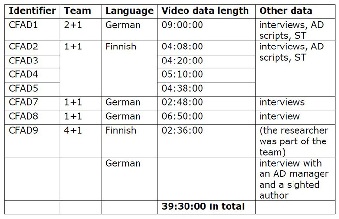 The MUTABLE project collected data from team AD in 2016–2017 in Germany, Finland, and Austria in order to have empirical – here meaning real-world or naturalistic – evidence of the teamwork practice in its different forms. Access to the field and research subjects (teams) was gained via the first author’s networks in the professional AD in the two language areas (Finnish and German). The sample that was compiled (Table 1) represents teams of different sizes and constellations and of different languages and cultures. In total, nine productions were observed (CFAD1–9, ‘Collaborative Film Audio Description’) and their team meetings recorded either completely or in part (only CFAD1 was not recorded in total due to lack of time; the team AD process would have lasted 4–5 working days, of which 1.5 days were recorded). Finally, one production process (CFAD6) was discarded from the data corpus due to lack of good quality data. The recorded teams were working on different translation commissions (five in total) and on different phases of AD production (see 4.1. below). The translation commissions were all from the field of audiovisual media but of distinct genres: feature films (two drama movies, a blockbuster action film, two arthouse movies), a documentary film, a lifestyle TV program, and a children’s/family TV series. Team constellations vary in the corpus from dyadic (one blind and one sighted member) to multi-party teams: three teams had two members (one blind, one sighted, marked as ‘1+1’ in Table 1), one team had three members (two sighted and one blind, ‘2+1’) and another one even five co-participants (three sighted audio describers, one blind consultant, and a professional speaker, ‘multiparty’). The multi-party team was a deviant case in Finland where it is not typical for AD productions to involve more than two sighted authors. Furthermore, the first author of this paper was part of the multiparty team by request because the actual team was in time pressure and needed more describers. Involving the researcher in the production process, as one of the subjects, may have affected the naturalness of data, for instance if the researcher-subject steers the team’s interaction toward actions that are relevant for the research project (such as to the discussion of certain translation problems). In this case, the researcher-subject was conscient of this potential impact and attempted to behave “merely” as one of the team members. On the other hand, the participation may have also had a positive effect on data collection if helping the team resulted in building more trust between the subjects and the researcher. All in all, the sample can be described as representative of the versatility of the team AD practice, but it does not entail representative samples of each subpractice (type of teamwork, country) in separate.