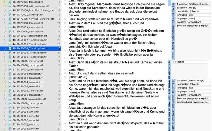 In this article (Sec. 4.), we report on the analyses of collaborative translation and problem solving based on video and interview data. The data were first prepared for analysis by transcribing speech and other auditory information (e.g., the soundtracks of source-texts) of the teamwork (video) and interview (audio) recordings. In the second step, the video transcripts were coded in Atlas.ti software in order to identify and locate recursive items and passages in the data (e.g., where and what kind of translation problems occur); an example of coding is given in a screenshot in Figure 2. On the left, a list of transcriptions (document names) is visible, and the document currently opened for analysis is highlighted in blue. The middle part (black text in white background) shows the transcript that is being coded and analysed, and the right part shows the codes given to this particular segment. The current screenshot in Figure 2 displays a few minutes’ interaction from CFAD7 (1+1 teamwork in German). The middle of the transcription (line 73, located with a red arrow) corresponds to the data illustration above (Fig. 1): at this moment, Lars (the blind author) is making the gesture to make his candidate understanding perceivable to Alex (the sighted author).