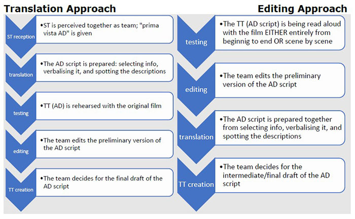 In what follows, we focus on co-translation in the AD scripting phase: an AD draft is either produced from scratch or edited by a team of sighted and blind authors (henceforth ‘S’ and ‘B’). We name these two different types of co-translation as the Translation Approach and the Editing Approach (Fig. 3). In the current state of the art of team AD, the Editing Approach is more common. It is also typical that S is recruited to the commission first and s/he coordinates the production and recruits B.