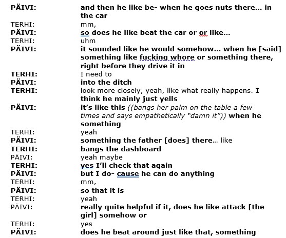 The interviews report on various types of influence that B may have in both the Translation and the Editing approach. Their work might begin by preparing for the team AD independently. Sometimes B participate in the end editing by checking the final AD script or by participating in the recording and voicing work in the studio. In the editing and translation work, B engages in safeguarding the plausibility and thoroughness of AD (“what I don’t understand or what is missing”), so that the audience can “construct a visual impression” or “augment the acoustic information [from the film]” with AD. Furthermore, they notice possible logical and linguistic mistakes, point out unclear passages and pay attention to style and rhythm of the text. Next, we will see how these play out in the teamwork by analysing the collaborative solving of translation problems.