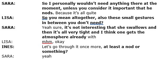 (In continuation, the film is being played, with Lisa and Ines explaining what is happening in terms of facial expressions, and Sara agrees that a nod can remain. Then Lisa and Ines conclude that the nod is not the most relevant of the gestures and it aligns with what the character says, so finally they leave the description out.)