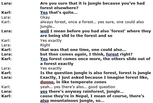 (For app. 6 minutes altogether, the team ponders about the right name for the scenery, during which S checks the film image again and describes it to B, and the team concludes that it corresponds to ‘jungle’. Although B voices her problems with the wording, it being incoherent with the previous AD using ‘forest’ and her doubts about the realism of the description (“Are there jungles in Nepal?”), she concludes ‘jungle’ should remain in the AD on the basis of S’ arguments in its favour.)