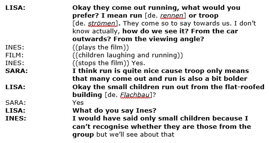 The sighted describer (Lisa) identifies a problem and requests confirmation from the blind describer (Sara) to her candidate descriptions. The other sighted describer (Ines) acts on this and plays the film briefly anew, after which the blind describer proposes a solution. It is confirmed/accepted by all members.