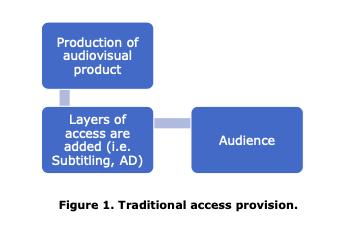 At the same time, both can be explained by what they do not do. In traditional access provision, access is a post-production step, whether this means subtitles or audio description being added to a television programme that has been signed off, or captions or audio description being added to a performance which has already had its first night (Fryer and Cavallo 2021: 45) or the addition of a different type of access (Figure 1).