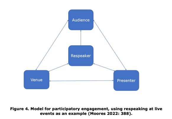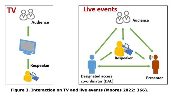Another feature of live events is their participatory nature. In each of these situations, there is likely to be communication between those who attend. At public talks or conferences, participants may be clearly identified as (either) ‘presenters’ or ‘audience members’, but there will be opportunities for — spontaneous — exchanges between them, for example, when questions are asked. Other events may not be built around the presenter/audience model but may present a space where contributions come from all attendees; a business meeting would be one example. As well as adding to the unscripted nature of the event, this participation and interaction is a key element that must also be captured within the access offered, especially if we think of the integration of media accessibility into the setting. While the mechanics of respeaking will be the same on television and at live events, this interaction changes the way a respeaker might need to work (Figure 3).