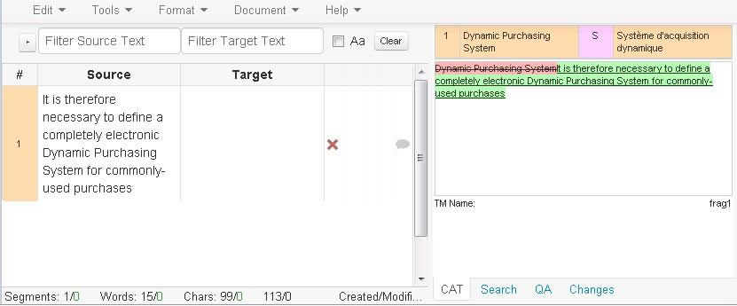 If ACS is available while translating the sentence, “It is therefore necessary to define a completely electronic dynamic purchasing system for commonly-used purchases,” then (subject to whatever settings) the fragment match “for commonly-used purchases” will be indicated, but without identifying that its translation was “pour des achats d’usage courant”; the translator must scan the target segment to locate it, as shown in Figure 4.