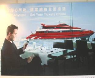 The next two samples are posters promoting two brands of ferry service between Hong Kong and Macao. The pictorial illustrations of the vessels on both posters help tourists to interpret the messages in the advertisements better, but to a varying degree due to the difference in the cognitive environments of the ST and TT readers, as elaborated below.