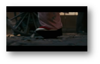 Figure 14 – Specification: geta AD: Memeha takes out onto a cobbled street to practise walking in geta, the raised wooden clogs worn by geisha. |