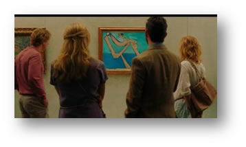 The scene is meant to be comical as the figure of the woman in the painting, with her limbs pointing in different directions and very thin hair, stand in stark contrast with Adriana, charmingly played by Marion Cotillard, who is also witnessing the scene along with the film's main character, Gil. The juxstaposition of the balding female figure, almost abstract in its quality, presented in the painting and adorable Adriana creates a comic effect (see Figure 19).
