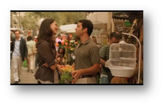 The two examples above are rather straightforward as the names presented are easily recognisable. There are other situations, however, where the naming strategy can come in useful even though the places are not immediately obvious from the screen, as shown in Figure 6 from Vicky Cristina Barcelona, where Ben and Vicky are walking along La Rambla. This major tourist attraction is not in any way hinted at in the dialogue nor is it given much attention in the scene. To the person who knows Barcelona, however, the place is immediately recognisable thanks to numerous stalls with flowers and birds.