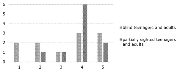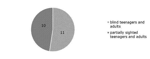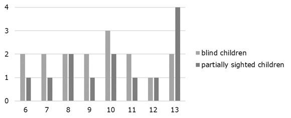 The first part of the study was conducted on 15th April 2013 in the special education centre for blind and visually impaired children and teenagers in Krakow (the centre's name in Polish is Specjalny Ośrodek Szkolno-Wychowawczy dla Dzieci Niewidomych i Słabowidzących w Krakowie). For technical and logistical reasons, and because it was the first such study I had conducted with children, I considered it important to repeat it to obtain more reliable results. However, the second time I decided to change the form of the test slightly by using the recordings in a different order. This part of the study took place in the summer and autumn of 2013 and involved children who were completely blind or had severe visual impairment, and whose parents had answered an advertisement on the Internet. As a result, 37 children with different types of visual impairment took part in the research; because of various intellectual disorders, 8 of them were later excluded. Initially, my study was meant to be a test involving primary school children only; nevertheless, after analysing the results and observing a set of tendencies, I became interested in older respondents’ opinions. Thus, blind and partially sighted adults were also provided with surveys sent to them by e-mail. To sum up, I analysed the responses of 29 children, 16 blind (12 congenitally blind, 4 who had lost their sight at pre-school or school age) and 13 with visual impairment (see Figure 1; their age structure is shown in Figure 2). The answers given by blind and visually impaired children were compared with the answers of children of a similar age without visual impairment (11 children aged 5-13) who watched Boundin’ with no AD. What is more, 21 teenagers and adults (among whom the youngest respondent had little more than 13 years and the oldest was 30) also took part in the research – 11 blind (8 of them born blind, 3 who lost the ability to see at school age) and 10 with visual impairment (see Figure 3). The aim of the test was to learn about their preferences (attractiveness and level of comprehension) for traditional and for rhymed AD. As a side product of the test, we acquired some knowledge about the influence of AD on the children’s language development.