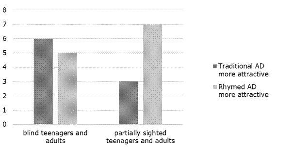 As far as attractiveness is concerned, especially younger children gave the same answers to both questions: which version of AD they liked the most and which of them enabled better comprehension. Overall, children did not like things which they could not understand, and became easily discouraged when the AD script (or even the film itself) required too much conceptual processing. Older children (mostly the partially sighted rather than the blind ones), with better-developed language competence, expressed the opinion that rhymes were ‘funny’ and made the cartoon more attractive. However, for most respondents of primary school-age (23 children), traditional AD appeared to be more amusing. This can be explained by the fact that it is more accessible to them as they are able to understand more of the subtle nuances and situational jokes. Moreover, it requires less focus and effort, thus constituting pure entertainment for them. The children said that because of the changed word order in rhymed AD, as well as because of the appearance of words which they did not expect at a particular moment, some parts of the film were not immediately clear, requiring them to focus more on listening.