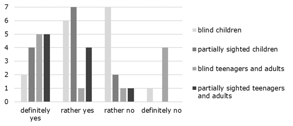 According to the results of the research, what people like and dislike in AD mostly depends on individual tastes and preferences, which are already shaped even in the case of really young respondents. Blind adults can be divided into people who very much liked artistic AD (5 people), those who disliked it (4 people), and only 2 people who expressed their doubts by the answers rather yes or rather not. There was also one person who thought that artistic AD was unnecessary and one who was positively surprised and who wished there had been more audiovisual productions audio described in more creative and atypical ways.