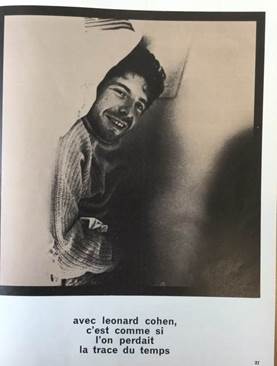 Next to Judy Collins, one should add here the name of Martine Habib. In an interview with Jacques Vassal (Mus 2016b), he said, “La toute première fois que j’ai entendu le nom de Leonard Cohen, et une chanson de lui, c’était lors d’un ‘Hootenann’ au Centre Américain du boulevard Raspail, à Paris, en décembre 1967. C’est une chanteuse française, Martine Habib, qui nous a chanté ‘Suzanne’” [The very first time that I heard the name Leonard Cohen and one of his songs was during a hootenanny at the American Centre of Boulevard Raspail in Paris, in December 1967. A French singer, Martine Habib, sang ‘Suzanne’ for us.”]
