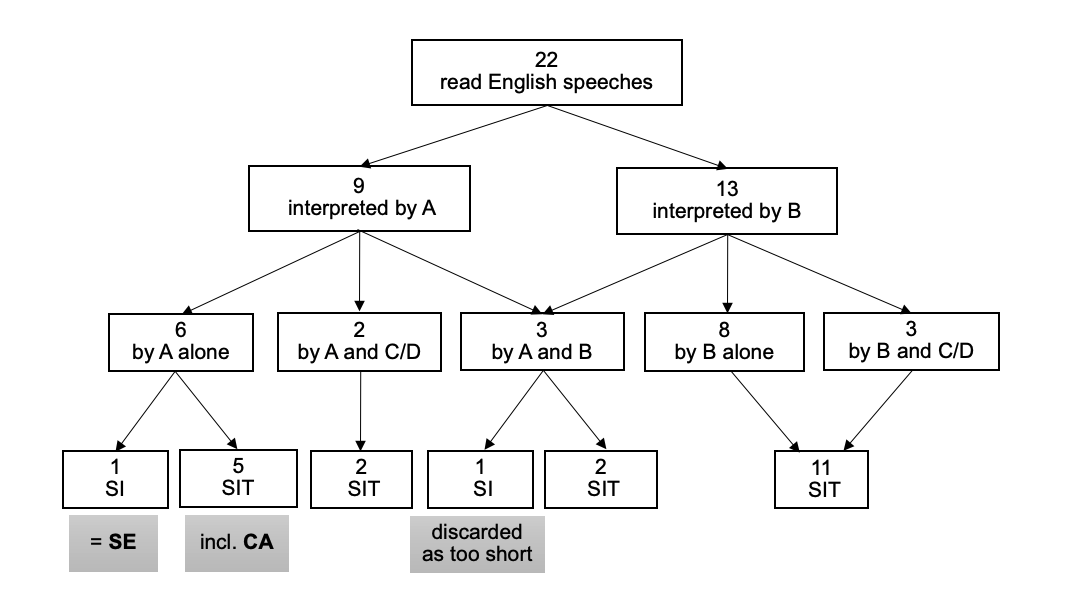 Out of the 22 speeches rendered by Interpreters A and B (see Figure 1), 17 had a length of 5–13 minutes (600–1500 words), the average being seven minutes (850 words), whereas the remaining five speeches lasted only two to three minutes.