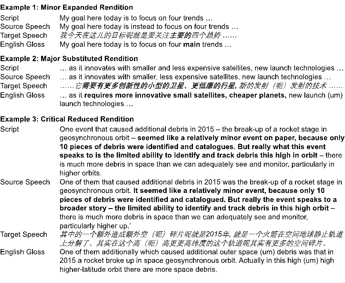 In Example 2, the phrase ‘smaller, less expensive satellites’ is substituted with ‘小型的卫星、更低廉的行星’ (small satellites, cheaper planets), and ‘as it innovates with’ is replaced with ‘它需要有更多创新性的’ (as it requires more innovative). While clearly deviating from the original, this rendering does not completely distort the meaning of the source-speech segment and is therefore classified as a major substituted rendition.