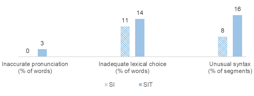 As shown in Figure 4, the three features assessed regarding target-language form were less frequent in SI than in SIT. Mispronunciation occurred only in SIT, where 3% of words were not articulated correctly. Inadequate lexical choices occurred in both interpretations but were somewhat more frequent in SIT. In SIT some of these cases were apparently due to source-language interference — that is, the use of a close Chinese equivalent with a misleading connotative meaning. Other instances of poor word choice, some of which in SIT and the vast majority in SI, involved unusual collocations or excessively literal, unidiomatic renditions. Moreover, the most pronounced differences in formal correctness were found for target-language syntax: the frequency of unusual syntactic constructions is twice as high in SIT as in SI.